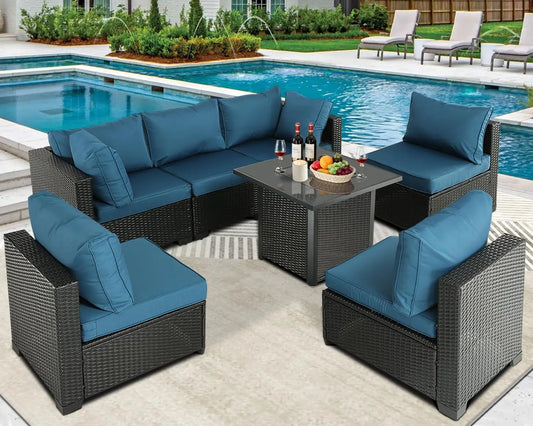 PE Rattan Patio Furniture Set with Cushions, Expresso, -Peacock Blue