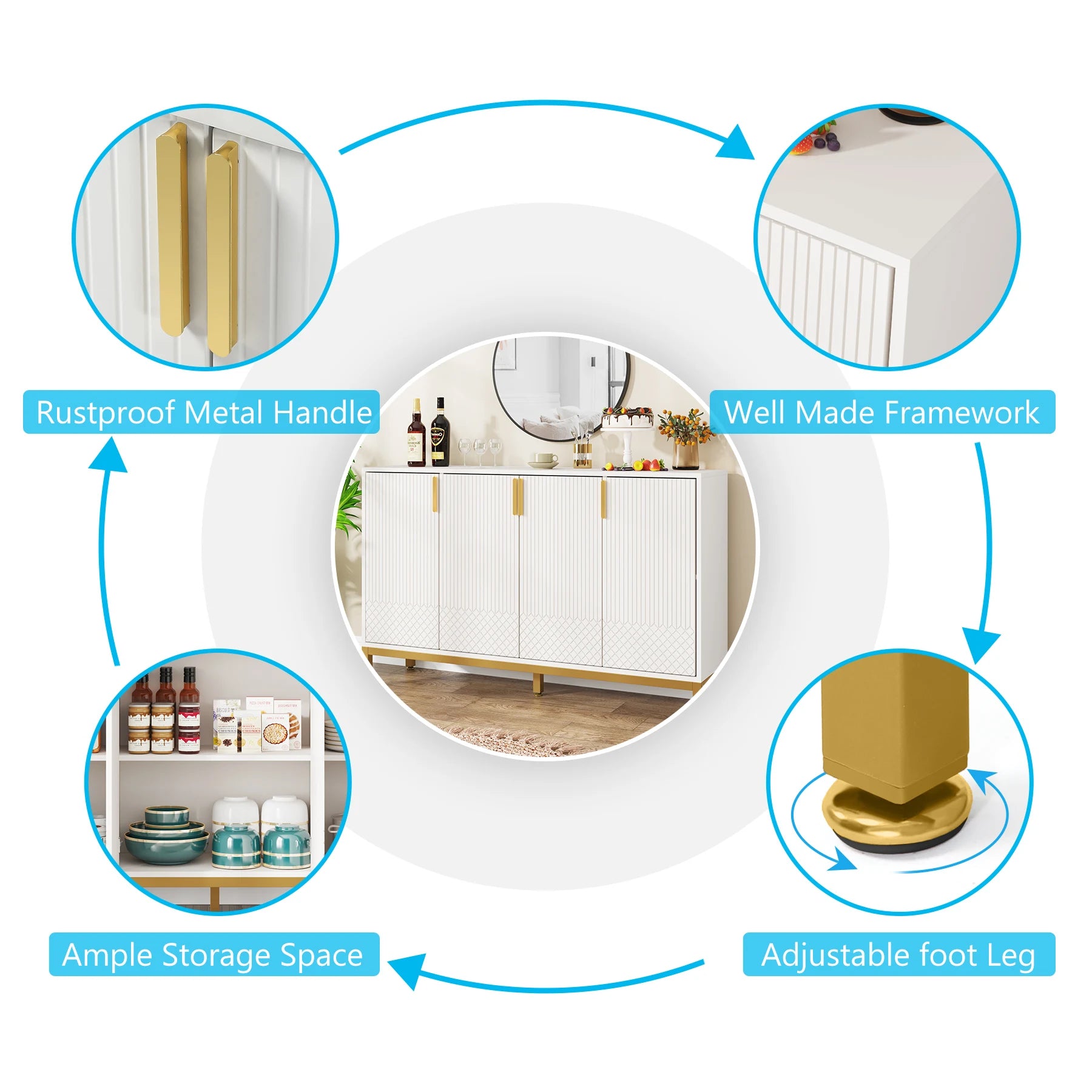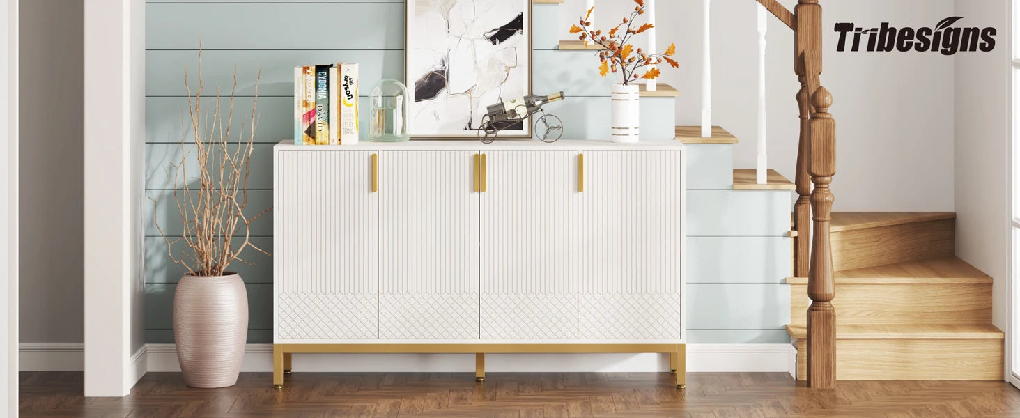 Tribesigns Modern Storage Console Cabinet Sideboard Buffet Cabinet with 4 Doors & Gold Metal Base